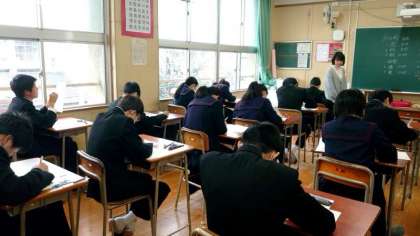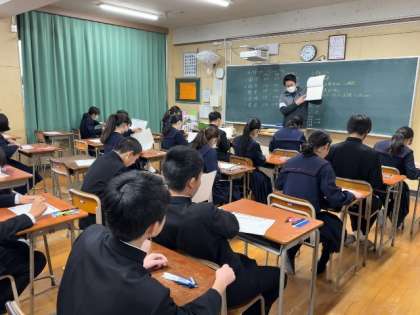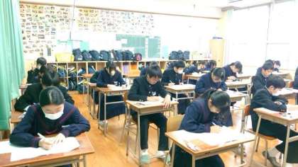 2年生も大阪府の「中学生チャレンジテスト」を頑張っています。試験時間は45分。ふだんの校内テストより5分短いので、時間配分に注意が必要。一通り解いた後、解答を見直す時間を確保して、うっかりミスを防ぎましょう。