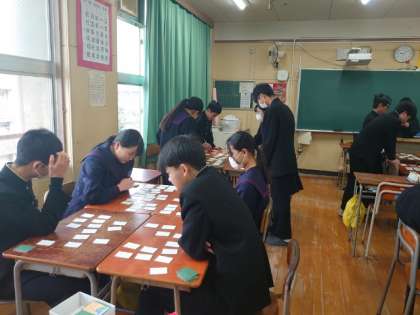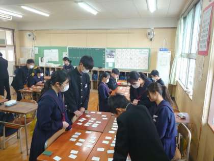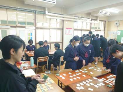 来月2年生で開催予定の「百人一首大会」。教室では大会に向けた練習が行われています。それぞれ6人程度のグループに分かれて取った札の数を競います。先生が上の句を読むと、すぐに取り札に手を伸ばす姿が。皆さん、けっこう覚えているようですね。