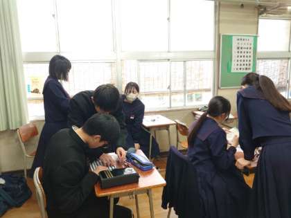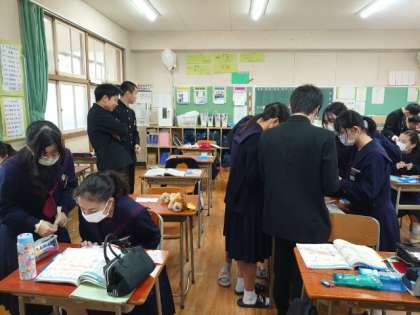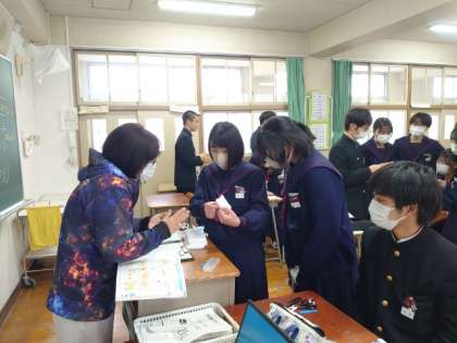 3年生家庭科でお裁縫のテストが行われます。今回は「まつり縫い・返し縫い」の実技テスト。1人ずつ白い布が渡され、上手に縫えるか試されます。テスト開始前の教室は、先生に質問する人や友達同士で縫い方を確かめる姿が。上手く出来ることを祈っています!