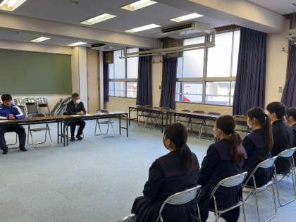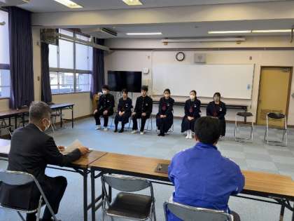 3年生対象に面接の練習が始まりました。一部の高校入試で行われる面接選考に向けて、やりとりを体験します。中学校生活で頑張ったことなど、自身の経験を踏まえて、しっかりとお話できていましたね。