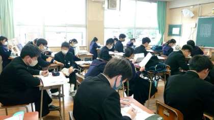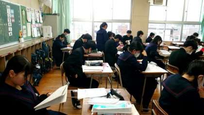 今日から3日間、3年生学年末テストを実施します。テスト開始前の教室では、懸命に学習内容を確認中。今日の教科は「理科・英語・音楽」。3年生の皆さんはお昼12時頃の下校となります。