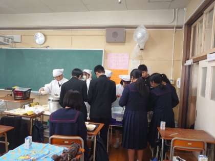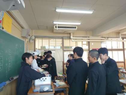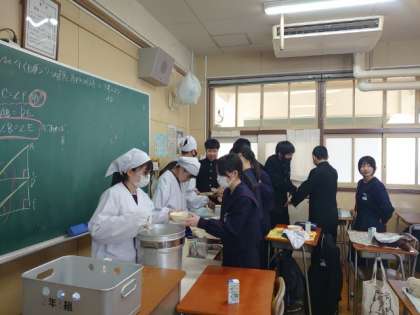 お昼のチャイムが鳴り、2年生の教室で給食の配膳が行われています。今日の献立は「鶏の甘辛焼き・かす汁・栗きんとん」。