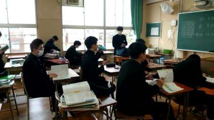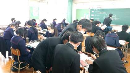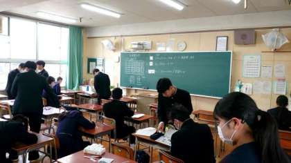 テスト2日目になりました。朝の教室は、ワークやプリントに目を通す人がいっぱい。机を囲んで、出願内容を予想するグループもいるようです。予想が的中すると良いですね。今日のテストは「国語・美術・保健体育」の3教科。皆さんの健闘を祈っています。