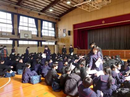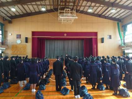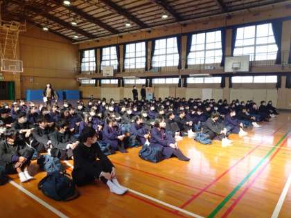 学年末テストが終わった3年生が体育館に集まり、私立高校願書出願の諸注意を聞いています。明日は昼食(お弁当)をいただいた後、受験する高校毎にグループで出発する予定。今シーズン一番の寒波到来が予想される中、防寒対策を忘れないよう気をつけてくださいね。