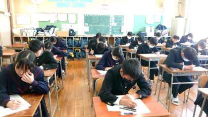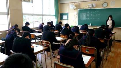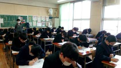 2時間目は数学のテスト。ベーシックな計算問題をはじめ、円周角や作図・証明問題など、中学校での数学の学習の集大成を感じる内容です。作成した数学科の先生方の熱い思いが込められた問題を全力で解きましょう。