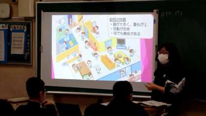 1年生家庭科で「住まいの安全対策 家庭内事故(幼児編)」を教わります。幼児は頭が大きく重心が高いので、転倒しやすく注意が必要。洗濯機やお風呂をのぞきこんで洗濯槽や浴槽に入ってしまうケースも。また興味ある物を口や鼻、耳に入れたりするので、物の置き場所も気をつけないといけません。事故を未然に防ぐために出来ることを考えましょう。