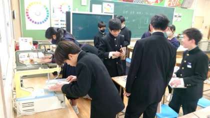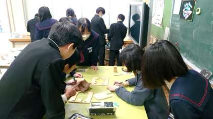 2年生美術科で制作中の木彫パズル。木の板への下書きもほぼ終わり、パーツを削り出す工程に取り組んでいます。電動糸ノコギリのモーター音が美術室に響きます。先生から彫刻刀の使い方を教わるグループも。皆さんそれぞれ作業が順調に進んでいるようです。