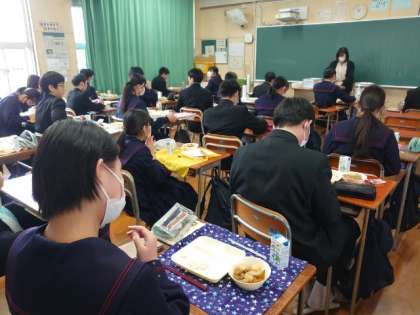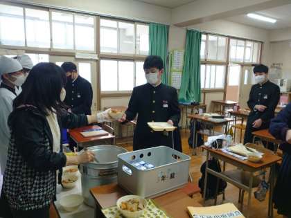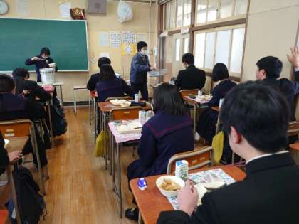 午前中の授業が終わり、給食の時間が始まります。3年生の皆さんが協力して準備中。今日は「イワシの生姜醤油焼・根菜の煮物・炒り豆」の節分献立。焼いたイワシ(頭部)は鬼が苦手だそうです。しっかりいただいて、皆さんにたくさんの福が来ますように!