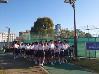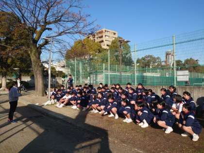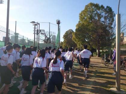 真田山公園の周回コースを駆け抜ける「真田山公園杯」。2年1、2組の皆さんがやってきました。快晴の冬空の下、風も無く、好タイムが期待できそう。皆さん、頑張って走りましょう!