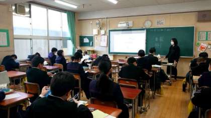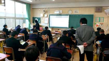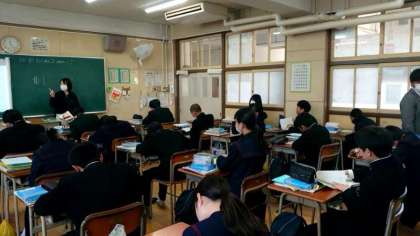 1年生英語の授業で「There is (are) 〜 」の構文を復習しています。「〜がいる(ある)」という意味とのこと。今日はこの構文を使った問題プリントを解き進めます。決められた制限時間内に解かないといけないので、解くスピードも重要になりますね。
