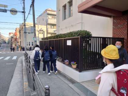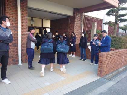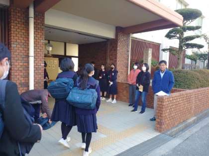 ピリッとした空気に包まれた朝。今日から2日間、2年生が職場体験に出かけます。校門前では、これから体験先に向かうグループの姿が。元気な声で「行ってきます!」とあいさつしてくれるのが嬉しいですね。実り多い体験になりますように。