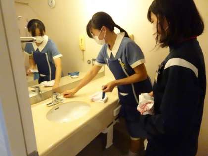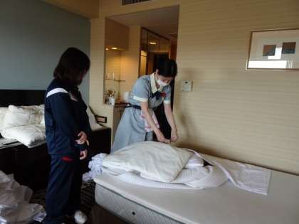 2年生の皆さんが職場体験活動中。中央区の5つ星ホテルでは、ベッドメイクをはじめ、お客さまが心地よく過ごしていただくためのノウハウを教わります。おもてなしの心を学べそうですね。
