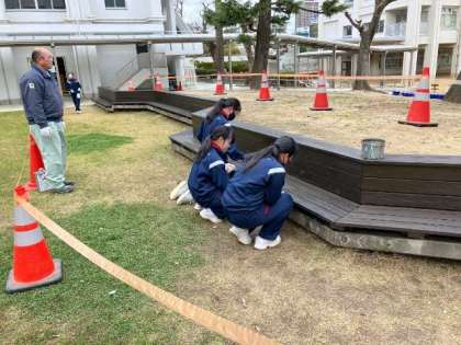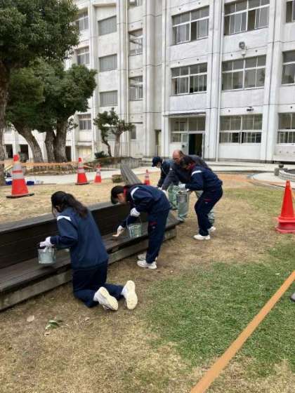校区の真田山小学校では、中庭にあるベンチの塗装をお手伝い。校内の環境整備も学校の大切なお仕事の1つ。キレイに仕上げてくださいね。