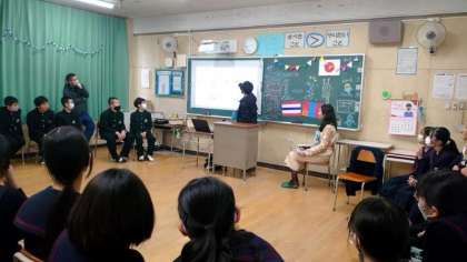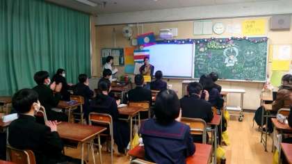 体育館での全体交流会が終わり、各教室で分科会が行われています。留学生の方々が2名ずつに分かれてクラスにやってきました。スライド等を交えて自国の文化や習慣を紹介してくださいました。教科書には載っていないお話はとても興味深いですね。