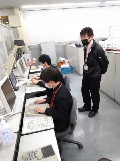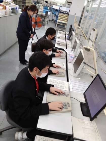 上汐にある天王寺郵便局でお仕事の体験中。パソコンを使ってでデータ処理を行っているのかも。中学校のいろんな教科で取り組んでいるパソコン活用のスキルが活かされますね。