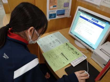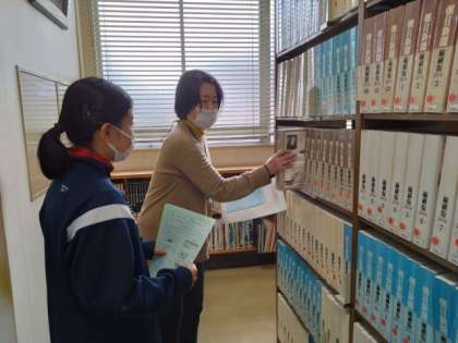 天王寺図書館でお仕事を体験中。書庫に入らせていただき、蔵書を確かめます。ふだん利用している図書館の違った一面を体験できましたね。