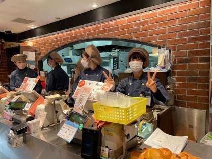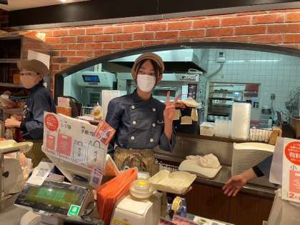 桃谷駅前にあるパンの鳴門屋さん。お店の制服を着させていただきました。たくさんの美味しいパンに囲まれて楽しそう。いっぱい買ってもらうよう、頑張ってくださいね。