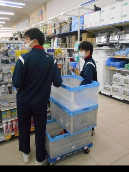 玉造1丁目にある「ロイヤルホームセンター森ノ宮」さん。工具や資材、家庭用品など多くの商品が扱われる大型店です。コンテナを転がして文具コーナーの商品補充を行います。場所を間違えないように気をつけてくださいね。
