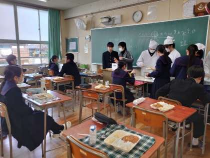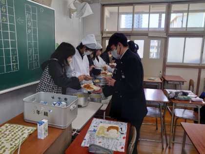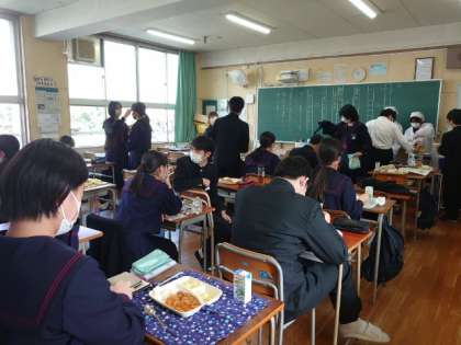 お昼休みになり、3年生の教室では給食の準備中。今日は「ハヤシライス・キャベツのサラダ・洋なし」の人気メニュー。デミグラスソースの風味が香るハヤシライス。ルーをたっぷりかけて、いただきましょう。