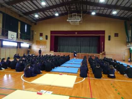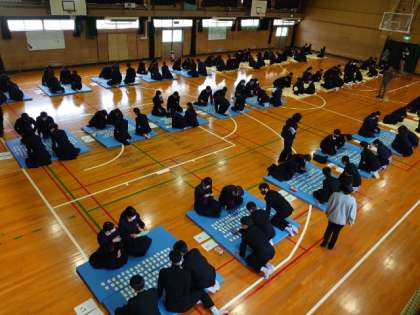 体育館に2年生の皆さんが集まりました。まもなく百人一首大会が始まります。フロアには畳が敷かれ、次々に手札が並べられています。どのクラスも優勝めざして頑張ってくださいね。