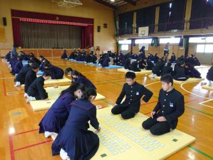 いよいよ試合がスタートしました。先生が上の句を詠み始めると、勢いよく手札を取る強者がいる模様。多くの歌をしっかりと覚えているのでしょうね。鮮やかな手さばきに感心します。