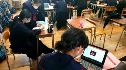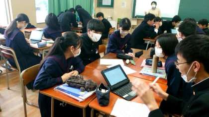 3年生英語の授業で「ノーベル平和賞」受賞者のプロフィールを英文にまとめます。教科書でインドのマハトマ・ガンディーさんのお話を学習したので、タブレット端末を活用して他の受賞者を調べてみます。まとまればグループ毎に発表するそうですよ。