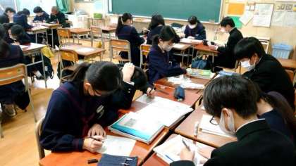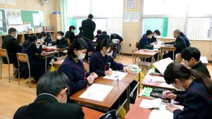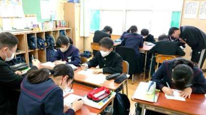 1年生社会科で地形図の問題に取り組んでいます。今日はグループになって、互いに教え合いながら問題を解き進めます。等高線から土地の断面図を書きおこす問題もありますね。みんなで協力して満点をめざしましょう。