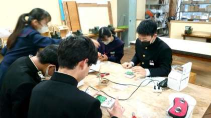 3年生技術科では、トランジスタラジオを製作中。皆さん、コンデンサーやダイオードを基盤に取り付ける作業 ( ハンダ付け ) を行っています。ハンダごてが熱いので、ヤケドに気をつけてくださいね。