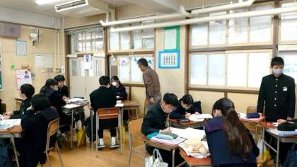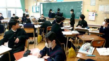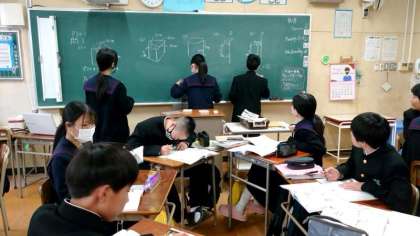 1年生数学の授業で立体の体積を求める問題を解いています三角すいや円すいなど、さまざまな問題をグループ毎に解いていきます。みんなで相談し、黒板に解答を書いていきます。見事正解できましたか?