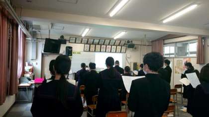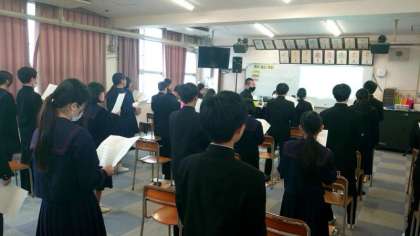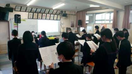 1年生音楽の授業で「蛍の光」を歌います。卒業式まであと2週間余り。在校生の皆さんが、卒業する先輩方に送る曲。 式当日には歌詞カードを見ないで歌えるように、しっかりと覚えてくださいね。