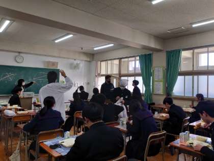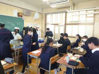 お昼休みになり、3年生の皆さんが給食をいただいています。今日の献立は「鱈のフライ・鶏と野菜の汁物・ホウレン草のおひたし」。午後からは学年レクリエーションを予定しています。しっかり食べて、活動に備えましょう!