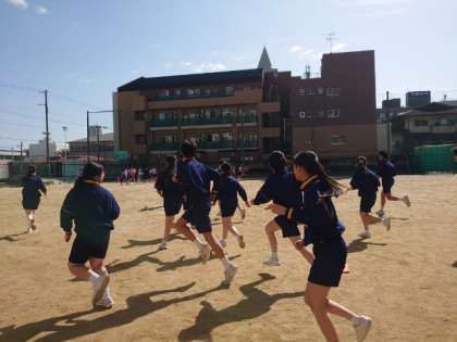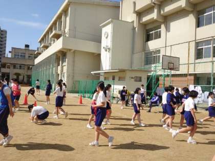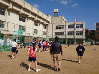レクリエーションの内容はクラスの代表が相談して決めた「クラス対抗 大鬼ごっこ (警泥と言うそうです)」。運動場いっぱいに広がって、狙う相手にタッチします。想像以上にスタミナが必要みたい。みんなの笑顔が良いですね。