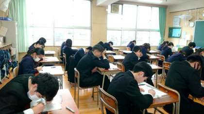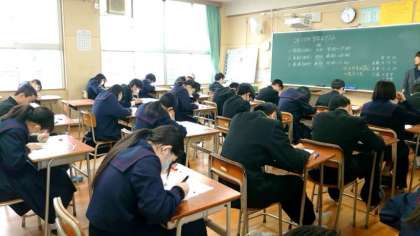 2時間目は美術のテスト。2年生の皆さんが集中して解いています。実技問題では、ロダン作「考える人」を模写するようです。陰影の付け方で立体感が変わります。短い時間ですが、完成度を高めましょう。