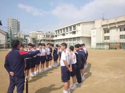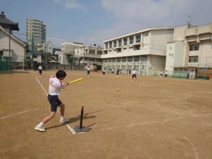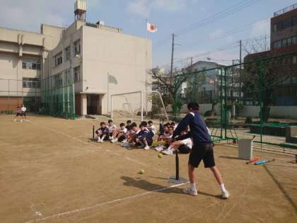 2年生男子体育で「ティーボール」の試合を行います。バッティングティーにボールを載せて、止まったボールを打つゲームだそうです。正式には1チーム10人制ですが、今回はクラス対抗戦。男子全員で試合に挑みます。野球とよく似たスポーツ競技をみんなで楽しんでいます。