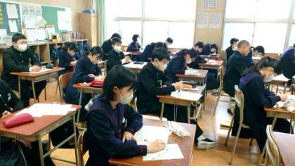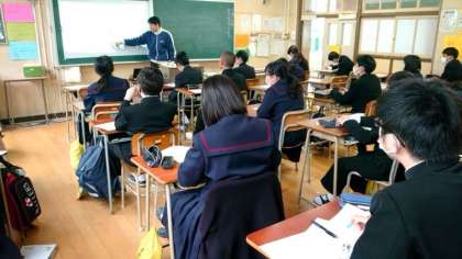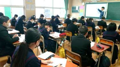 1年生社会科でこれまでの学習内容を振り返ります。スクリーンには真ん丸の地図が映されています。「正距方位図法」と呼ばれる図法で、地図の中心からの方位や距離が正しく示される地図です。地図によって特徴が異なるので気をつけてくださいね。