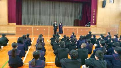 水曜日の朝は1年学年集会が行われます。会の後半は学級委員さんが気付いたことをみんなに呼びかけます。より良い学年をみんなで作ろうとのメッセージは、この1年間の成長を感じます。もうすぐ2年生。中心学年として学校をリードしてくださいね。