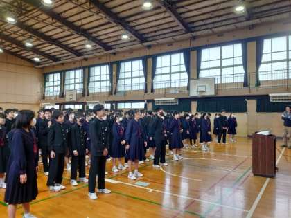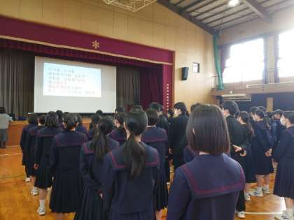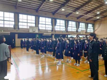 木曜日の朝は2年学年集会。今朝は、本日6時間目に開かれる「3年生を送る会」で、送別の歌を練習しています。歌詞に込められたメッセージを頭に入れて、先輩方を送りましょう。