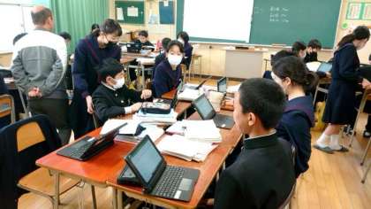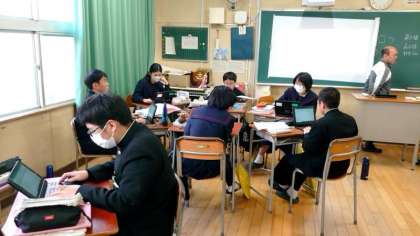 1年生数学の授業でさまざまなデータの活用について学習します。データを整理して度数分布表やヒストグラムを作成します。授業ではタブレット端末を活用し、データ入力〜処理を進めます。エクセルソフトを使うと便利だそうです。皆さん、上手く入力できそうですか?