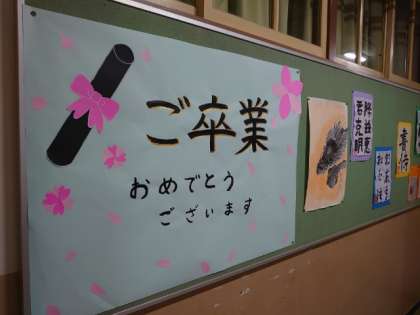 3年生の教室前廊下にメッセージカードが飾られています。卒業を前に1、2年生がメッセージを書きました。感謝の気持ちや新たな旅立ちを祝う言葉の数々に、先輩を想う気持ちが感じられます。
