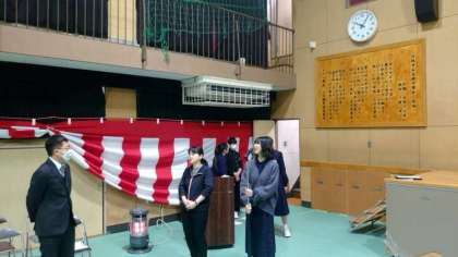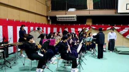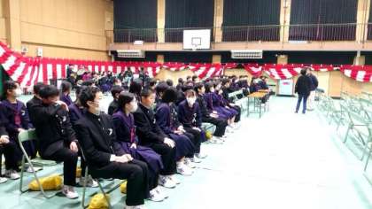 まもなく、明日の卒業式に向けた予行演習が始まります。式に参列する在校生・吹奏楽部の皆さんもスタンバイ完了。卒業生の入場を待っています。