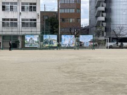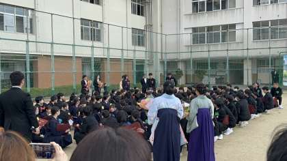 運動場にやってきた卒業生。どうやら学年集会を開いている模様。運動場には2年生の時に文化祭で制作した大阪・広島のモザイクアートが展示されており、記念写真の背景にぴったりです。