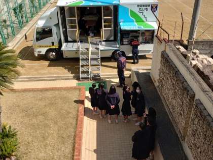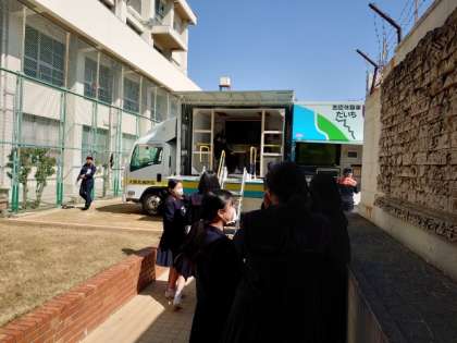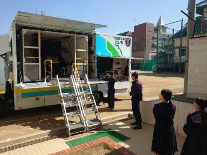 消防署の方々が起震車を準備してくださいました。地震を擬似体験できる特別なクルマです。今日は震度7の揺れを体験させてもらえるとのこと。何かに掴まっていないと、振り落とされてしまいますね。