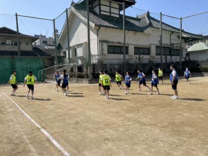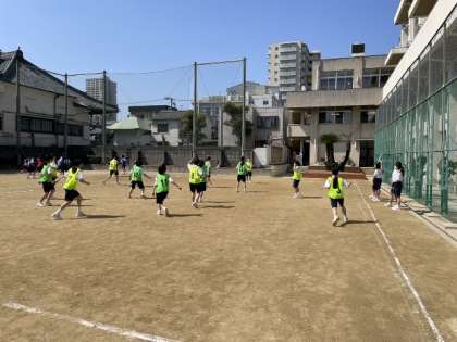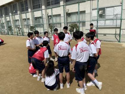 皆さん、各クラスカラーのゼッケンを身に付けて試合に挑みます。晴れてはいるものの、風があるので、フリスビーをコントロールするのが難しそう。上手く風を味方にして、ゴールを勝ち取りましょう。