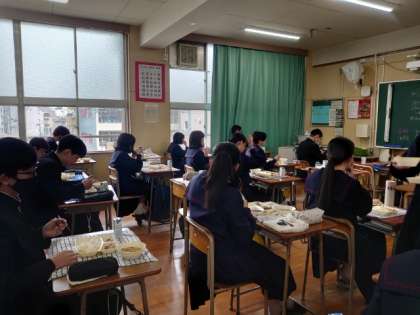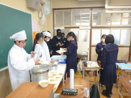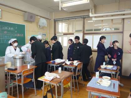 午前の授業が終わり、2年生の教室で給食の準備が始まりました。今日のメニューは「マグロの甘辛焼・豚汁・茎ワカメの佃煮」です。このクラスで給食をいただくのも後1回になりました。今日と木曜日、楽しくいただきましょう。