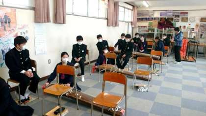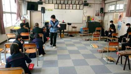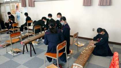 1年生音楽の授業でお琴の演奏にチャレンジします。数名が交代しながら一面 (一張) のお琴を演奏します。琴爪を装着し、弦を弾くと、美しいお琴の音色が音楽室に響きます。季節柄、「さくらさくら」を演奏したいですね。