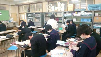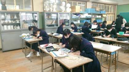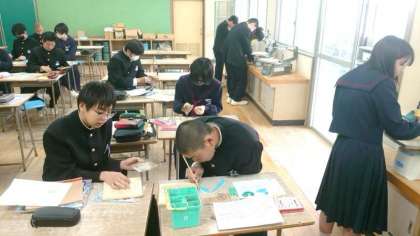2年生美術の授業で制作している「木彫パズル」。各パーツを削った人は、色塗りの工程に入っています。紙ヤスリでパーツを磨く人もいるようで、進み具合は人それぞれ。春休み中に仕上げるよう、宿題になるそうですよ。