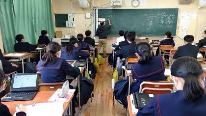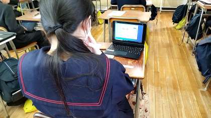 二次式の計算の単元です。生徒たちは、学習者用端末を机上に備え、「次数」や「項」などの数学用語の意味について調べています。