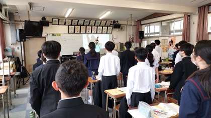 担当教員の全身を使った巧みな指導に触発され、子どもたちが大きな声で校歌を斉唱しています。小野十三郎作詞、川澄健一作曲の本校校歌は、昭和29年3月11日に制定され、以来70年にわたり歌い継がれています。