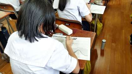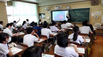 台風の定義や特徴をおさえた後、夏から秋にかけて、なぜ、台風が西から東へ日本列島を縦断するような進路をとるのか、そのメカニズムについて、生徒といっしょに考えました。