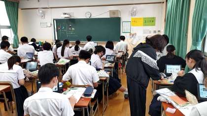 アップリケづくりに取り組んでいます。学習者用端末でデザインを考え、下書き用紙にトレースしたうえで、アップリケを完成させます。
